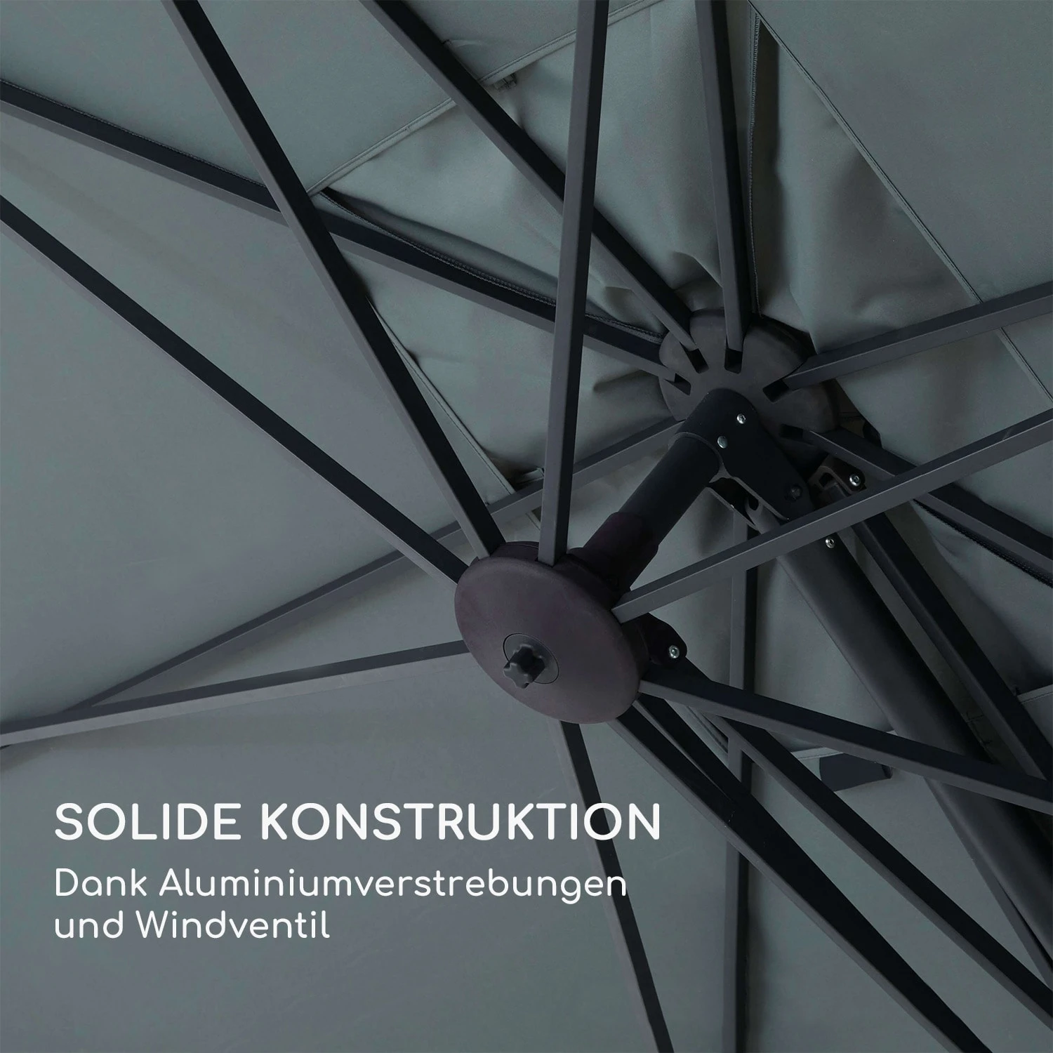 Sonnenschutz im Garten oder auf der Terrasse egal wo die Sonne steht? Mit dem blumfeldt Saint-Tropez Ampelschirm bist du dank 3-Achsen-Rotation bestens vor UV-Strahlung geschützt. Sein Fuß ermöglicht eine 360°-Drehung und das rechteckige Sonnensegel kann bequem sowohl seitlich als auch vorwärts und rückwärts gekippt werden. Somit richtest du den Schirm immer ideal zum aktuellen Sonnenstand aus, ohne ihn versetzen zu müssen. Die Bespannung besteht aus Polyamid und ist natürlich wasser- und schmutzabweisend, darüber hinaus liegt der UV-Schutzfaktor bei 50+ und schützt dich ausgezeichnet vor direkter Sonneneinstrahlung. Das Gestell des Saint-Tropez Sonnenschirms ist aus rostfreiem Aluminium, das mit einer Pulverbeschichtung überzogen ist. Hinter den stabilen Verstrebungen in der Schirmmitte findet sich ein praktisches Windventil für eine optimale Luftzirkulation.