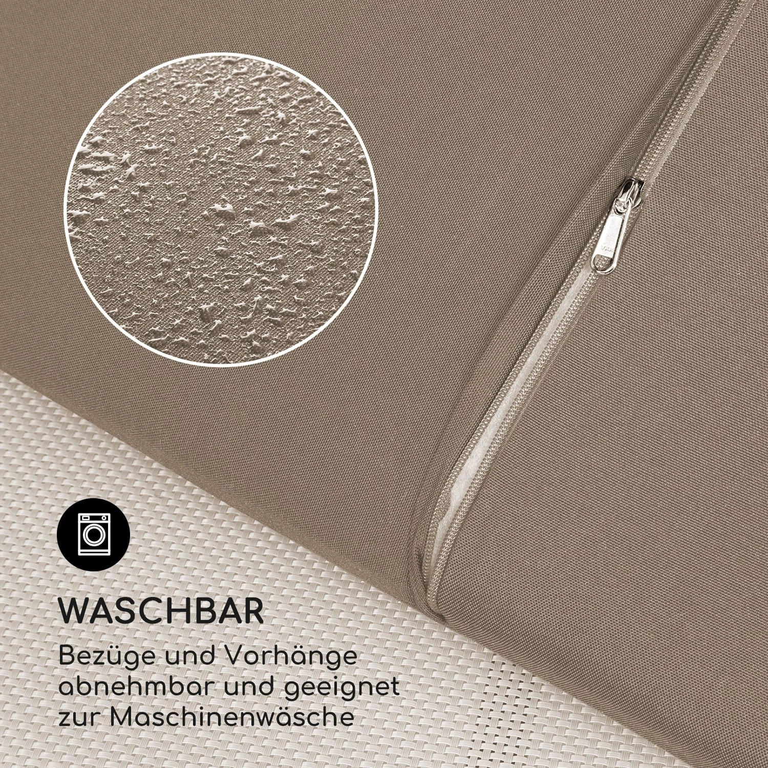 Stabil und praktisch sind die Ansprüche von Blumfeldt an die Senator Lounge Gartenliege. Entsprechend ist der 4 x 4 cm Stahlrahmen witterungsfest pulverbeschichtet und mit großen 8 x 8 cm Standfüßen ausgestattet. Das sorgt für eine maximale Gewichtsbelastung von 350 kg. Die Vorhänge sowie die Bezüge der beiden miteinander verbundenen Matratzen sind abnehmbar und können ganz einfach in der Maschine gewaschen werden. So bleibt der Pavillon lange schick und himmlisch entspannend.